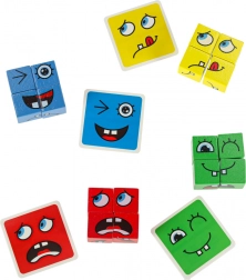 Gladko brušene kocke s potiskom oči in ust omogočajo sestavljanje desetine izrazov. Trpežne, varne in prijetne na dotik.