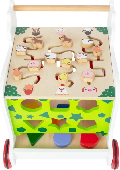 Šest delov vstavljanke, stranski labirint in vrtljive kocke pomagajo otrokom spoznavati oblike in barve, uriti koordinacijo oko–roka ter logično razmišljanje.