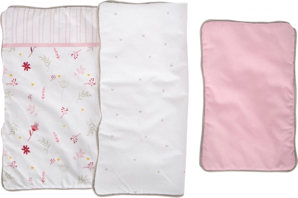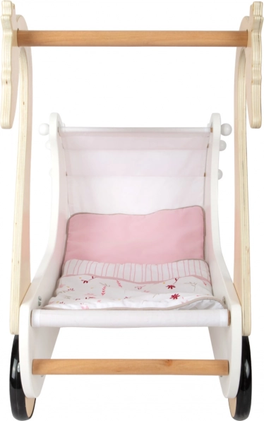 Okrašen v nežnih barvah in preprostih oblikah, ta voziček za lutke prispeva k udobni vsakodnevni skrbi zanje. Zaradi svoje trdne konstrukcije lahko sprejme lutke do velikosti 46 cm. Voziček je opremljen z zložljivo tekstilno streho, v paketu pa najdete dvodelno cvetlično roza-belo posteljnino. Gumirana kolesca zagotavljajo tiho in gladko gibanje na vseh površinah, medtem ko natančno izdelana konstrukcija iz odporne vezane plošče in masivnega lesa ponuja dolgoročno vzdržljivost.