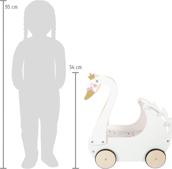 Doživite eleganco pri skrbi za svoje lutke s tem otroškim lesenim vozičkom v obliki laboda. Ta voziček spodbuja razvoj otroške domišljije in socialnih veščin ter popolno dopolnjuje vsako otroško sobo.