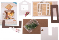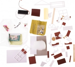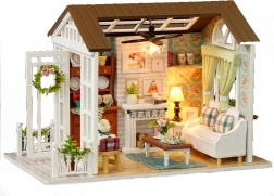 Set vsebuje vse potrebno za gradnjo dnevnega prostora in njegovo opremo, vključno z lepilom in podrobnimi slikovnimi navodili. LED osvetlitev, ki je del paketa, na baterije (2x AAA 1,5 V in 3x 1,5 V LR54 – baterije niso priložene), čudovito dopolni celotno atmosfero.
