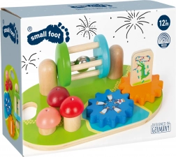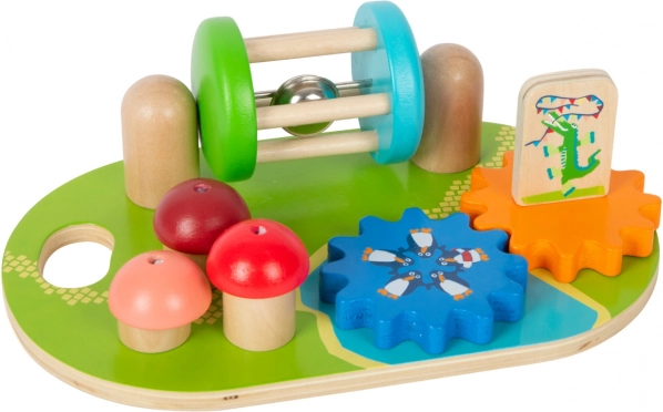Lesena plošča ponuja različne gibljive elemente, kot so zobniki in gobice, za razvoj fine motorike.