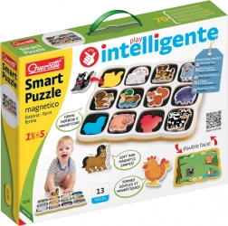 Quercetti magnetna vstavljanka Kmetija je čudovita igrača za malčke. Na eni strani table lahko otroci vstavljajo magnetke v pripravljene odprtine, kar jim pomaga razvijati prepoznavanje oblik in barv. Slikovni koščki se zaradi magnetov zlahka pritrdijo in jih je možno priročno shraniti za nadaljnjo igro.