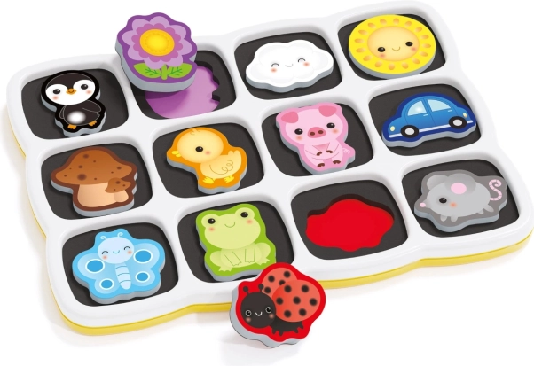Vsebuje 12 pisanih magnetnih koščkov, ki otrokom na zabaven način pomagajo učiti se barv in oblik.