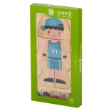 Komplet vsebuje leseno osnovo in 28 posameznih delov, ki segajo od okostja do oblačilne figure. Zaradi preprostega dizajna in naravnih materialov sestavljanka podpira načela metodike Montessori, ki se osredotoča na celovit razvoj otroka.