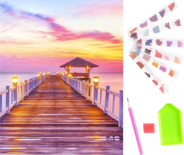 Odkrijte umetnika v sebi s tem diamantnim slikarskim setom in ustvarite čudovito umetniško delo. Set vsebuje vse potrebne pripomočke za preprosto ustvarjanje osupljive mozaike z motivom pomola ob sončnem zahodu.