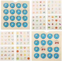 Lesena izobraževalna igrača z odstranljivimi količki in karticami s številkami. Pomaga otrokom učiti se številk in razvijati motorične spretnosti z povezovanjem količkov z ustreznimi slikami.