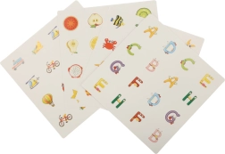 Komplet izobraževalnih kart z barvnimi črkami abecede in ustreznimi ilustracijami. Pomaga učiti in prepoznavati abecedo na zabaven in interaktiven način.