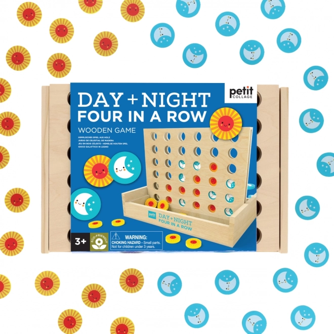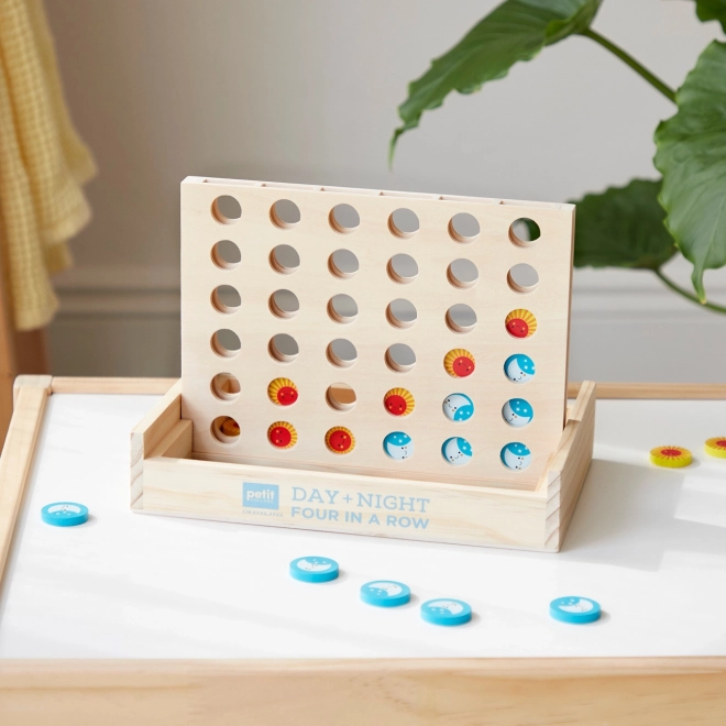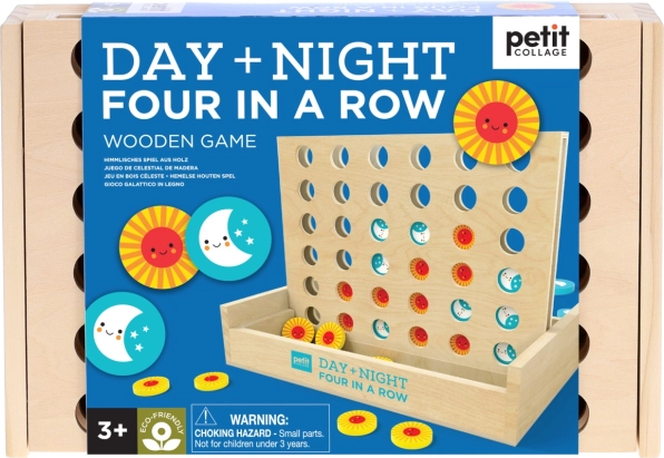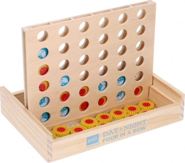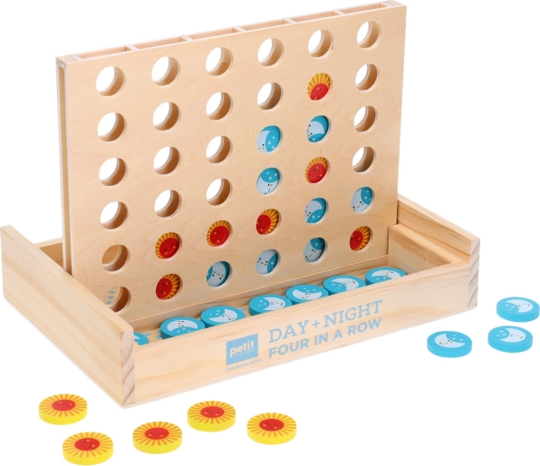 Lesena igra štiri v vrsti dan in noč zahteva od igralcev ne le hitro razmišljanje, temveč tudi sposobnost strateškega načrtovanja. Cilj je postaviti štiri žetone zapored na mrežo. Žetoni imajo atraktivno sonce in luna zasnovo, ki bo navdušila tako majhne kot velike igralce.
