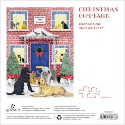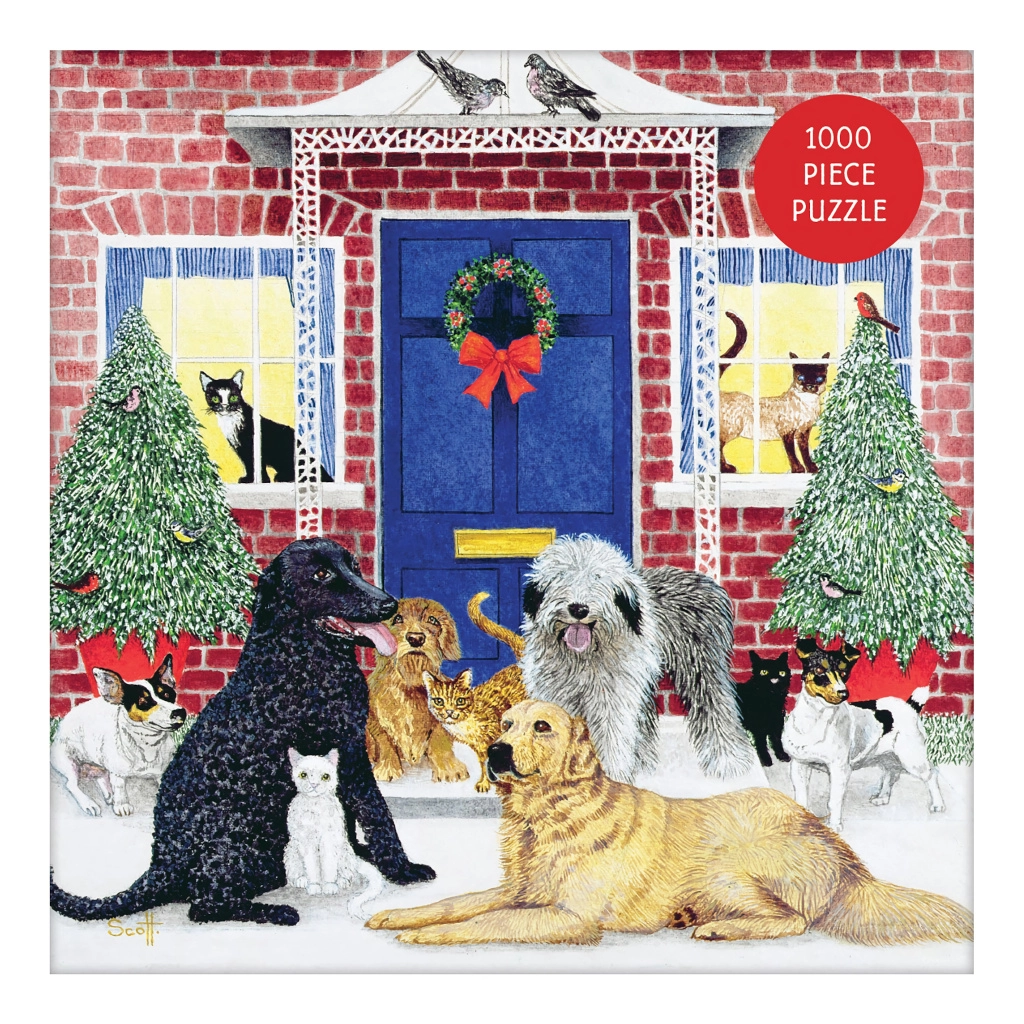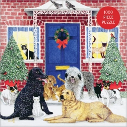 Odkrijte čar božiča z prizorom, polnim psov, mačk in prazničnih okraskov pred prijetno hišico. Sestavljanka s 1000 koščki ponuja veselje skrbnega sestavljanja in po dokončanju ustvari čudovito sliko, ki razveseli oko in srce.