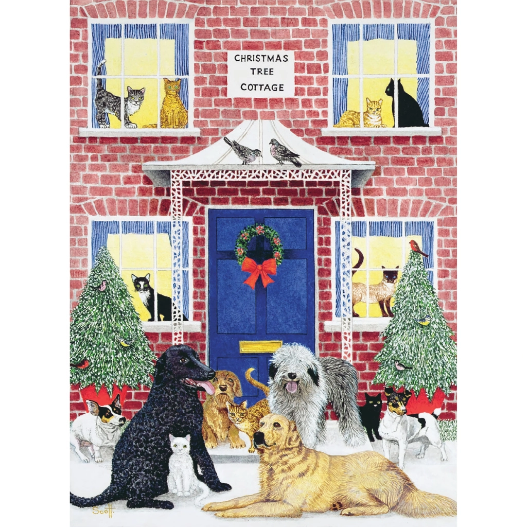 Motiv »Christmas Tree Cottage« z igrivimi psički in mačkami prinaša v dom praznično vzdušje in veselje ob sestavljanju.