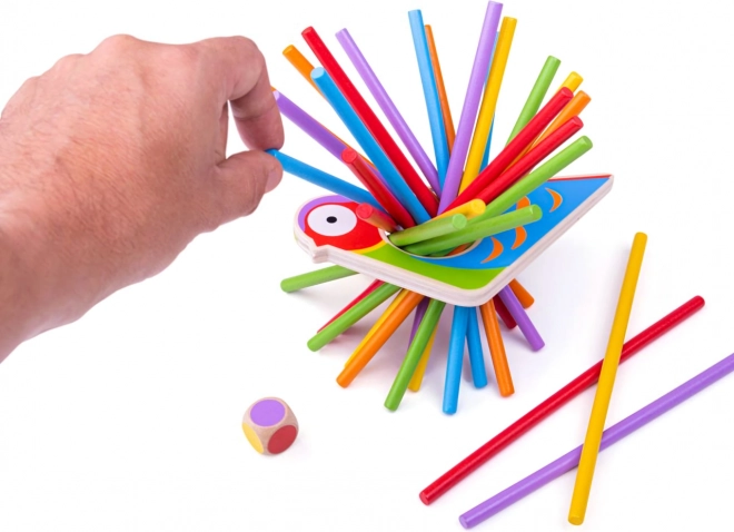 Potopite se v svet zabave s to igrivo igro, ki ne samo da razvija fino motoriko in koncentracijo, ampak tudi potrpežljivost in strateško razmišljanje. Pisano lesena igra ravnotežja je sestavljena iz čudovito izdelane lesene papige kot osnove in živobarvnih paličic za zlaganje. Igralci lahko vržejo kocko in se odločijo o svoji naslednji potezi, kar prinaša v igro element naključja in napetosti.Glavna ideja igre je preprosta, vendar nudi ure kakovostne zabave za vso družino. Igra je idealna za otroke, ki se z njo lahko učijo novih veščin v obliki igre.