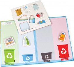 Magnetne zapiralne plošče in tematski elementi otroke vodijo k razumevanju recikliranja in varovanja narave. Igra podpira odgovornost in praktične veščine.