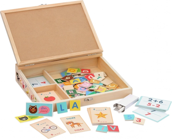 - Tabla, 2 kredI, 70 lesenih koščkov (črke, številke, znaki), 80 kart besedišča, 30 kart računskih nalog, 12 točkovnih kartic