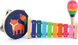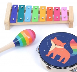 Komplet vključuje ksilofon, tamburin, trikotnik in marake, zato je odlično izobraževalno orodje za razvoj glasbenih sposobnosti in ritmičnega občutka pri otrocih.