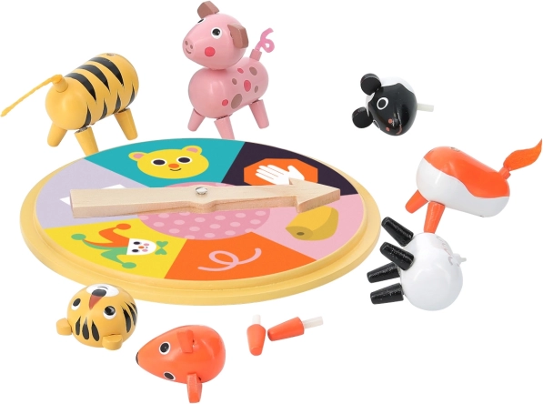 Kolo sreče prinaša v igro element sreče in napetosti, kjer vsak igralec postopoma sestavlja svojo žival glede na rezultat. Odlična dinamika za otroke!