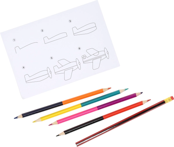 - Popolna oprema: risalna podloga, 4 dvostranske barvice (8 barv) in svinčnik z radirko.