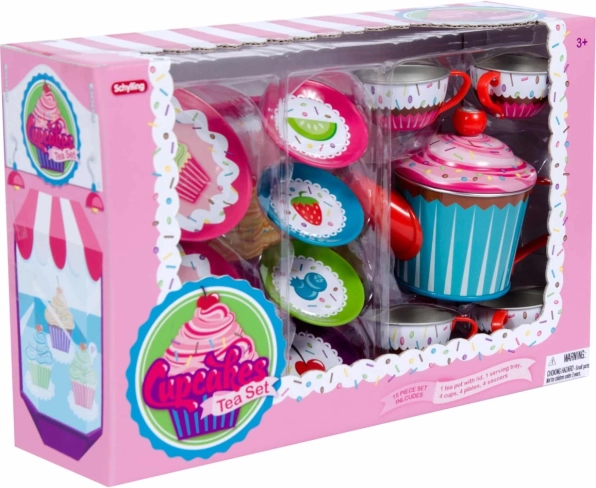 Celoten set je oblikovan s svetlimi barvami in okrašenimi motivi mafinov, kar ga naredi popolno izbiro za domišljijske čajne zabave.