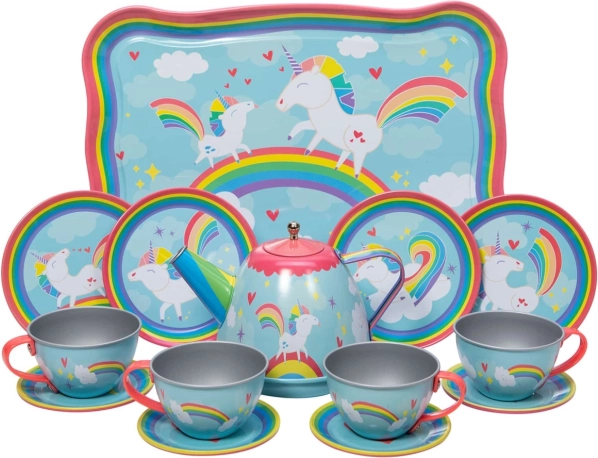 Prisrčen čajni komplet z motivom enoroga bo razveselil male gostiteljice in gostitelje. Vsebuje 15 delov iz trpežne kovine – skodelice, krožničke, krožnike, čajnik s pokrovčkom in servirni pladenj 24 × 16 cm. Idealno za igro domišljijskih čajank ter razvoj kreativnosti in socialnih veščin. Primerno za otroke od 3 let.