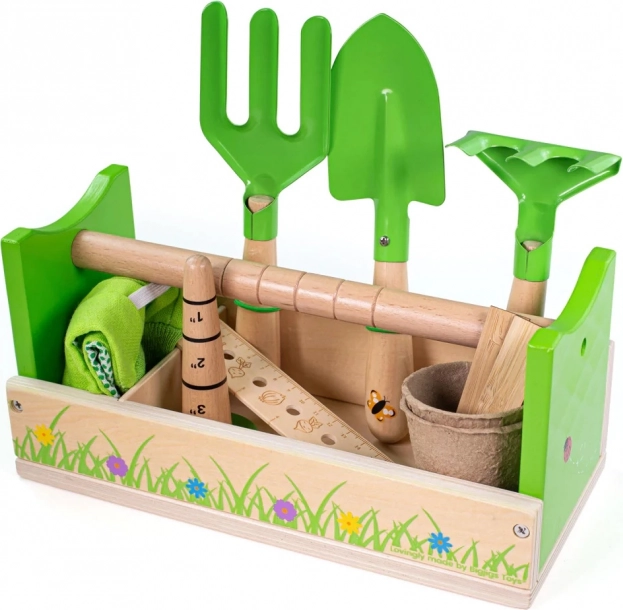 Otroški vrtnarski set v praktičnem zabojčku znamke Bigjigs Toys ponuja vse, kar mali vrtnarji potrebujejo za prve opravke na vrtu. Vsebuje 11 delov, vključno z rokavicami, ravnilom, sadilnim količkom in drugimi pripomočki. Orodje ima vzdržljivo izvedbo, lesene ročaje za lahek oprijem in je izdelano iz kakovostnih, odgovorno pridobljenih materialov. Primerno od 3 let dalje in izpolnjuje evropske varnostne standarde.