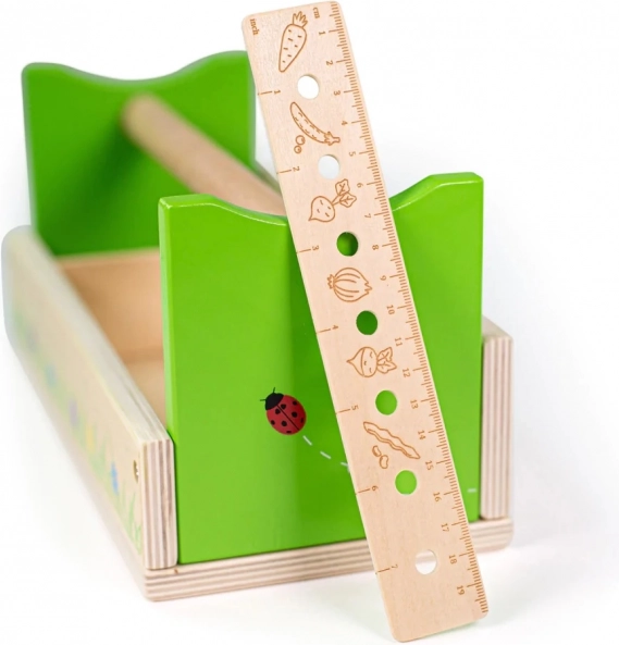 Ta barvit vrtnarski set razvija otroško spretnost, potrpežljivost in odnos do narave. Vse je shranjeno v trdnem lesenem zabojčku s svežim zelenim dizajnom z pikapolonicami in cvetlicami. Otroci se lahko varno preizkusijo v sajenju, rahljanju ali merjenju in pri tem posnemajo odrasle.