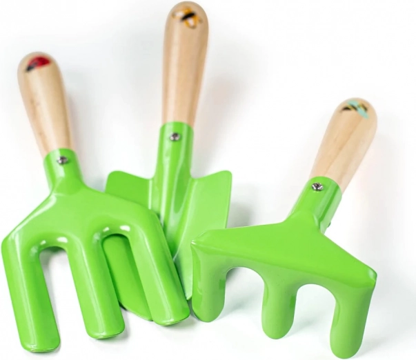 Vsak kos je zasnovan za majhne roke: gladki leseni ročaji prijetno sedejo v dlan, kovinski deli so vzdržljivi, tkaninske rokavice pa ščitijo pri delu. Set je odličen za igro na vrtu ali v peskovniku, zahvaljujoč priročnemu pakiranju pa je vse vedno pri roki.