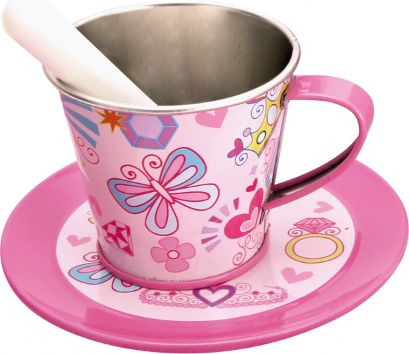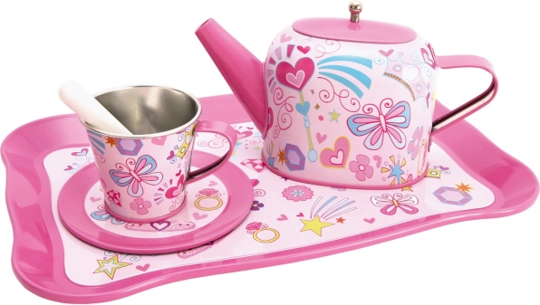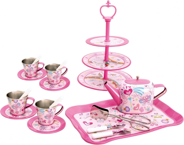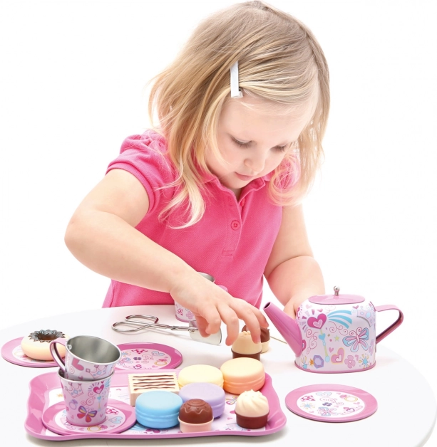 Čas za čarobni čajni piknik! Ta bogat otroški čajni set ponuja vse za zabavno pogostitev s starši, punčkami in pliškoti. Set je podrobno okrašen, izdelan iz trpežne lahke kovine in neoporečne plastike ter spodbuja domišljijo, sodelovanje in komunikacijske veščine. Vsebuje servis za 4 osebe in skupaj 35 delov, vključno s stopničastim stojalom za sladkarije.