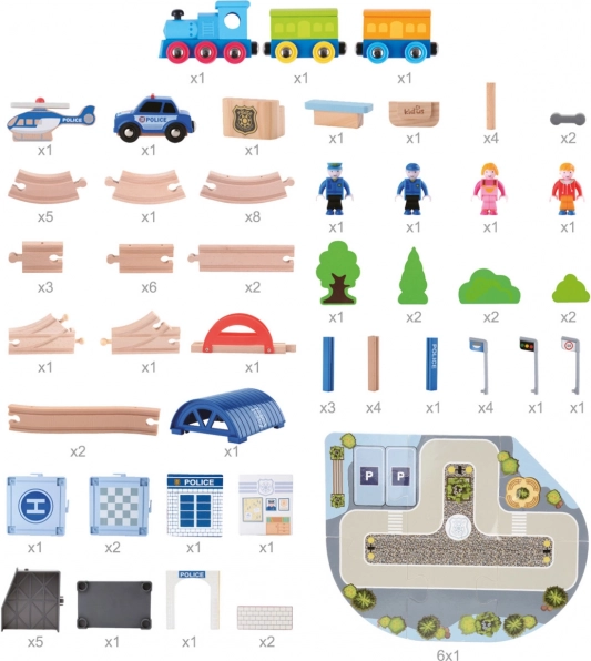 Ta podrobno oblikovana lesena vlakovna proga je idealna za male inženirje, ki obožujejo vlake in policijske pustolovščine. Vključuje progo z mostom, privlačno policijsko postajo ter druge dodatke, vključno z avtomobilčkom in helikopterjem.
