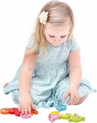 Vzdržljiva izdelava iz masivnega lesa ter žive, varne barve zagotavljajo dolgo življenjsko dobo in varno igro. Deli so dovolj veliki in jih je enostavno držati v majhnih rokah, zato je sestavljanka primerna tudi za začetnike.