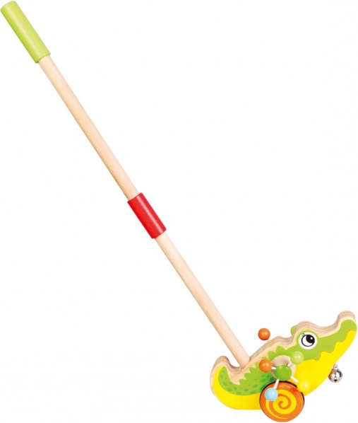 Visokokakovostna, priljubljena lesena igrača v obliki krokodila. Krokodil na palici z zvončkom, ki med vožnjo oddaja zvoke. Igrača, ki jo lahko otrok potiska pred seboj, pomaga razvijati motorične sposobnosti. Otroci se na ta način tudi učijo razlikovati barve in živali. Hodilica ima gumirana kolesca za tiho vožnjo. Otroci jo lahko potiskajo ali vlečejo doma in na prostem. Čudovito darilo za vašega otroka. Glavne lastnosti: podpira otroka pri prvih korakih, zabavna in prikupna, razvija motorične sposobnosti