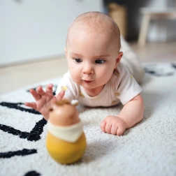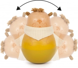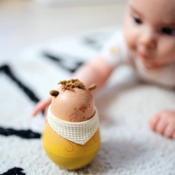 Interaktivna igrača z zvončkom v notranjosti, ki ob vsakem gibu spodbuja slušno zaznavanje. Mehanizem samopostavitve razvija motorične spretnosti.