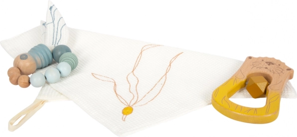 Ta 3-delni komplet za novorojenčke je idealen kot 'prve igrače' za vašega otroka. Set ponuja grizalo in ropotuljo v enem morskem vidru, bombažno krpo za ljubkovanje ali slinjenje in senzorično igračo kačjega pastirja s krili, ki vsebujejo šumečo folijo. Vsaka igrača je zasnovana z namenom razvoja motoričnih sposobnosti in senzoričnega zaznavanja.
