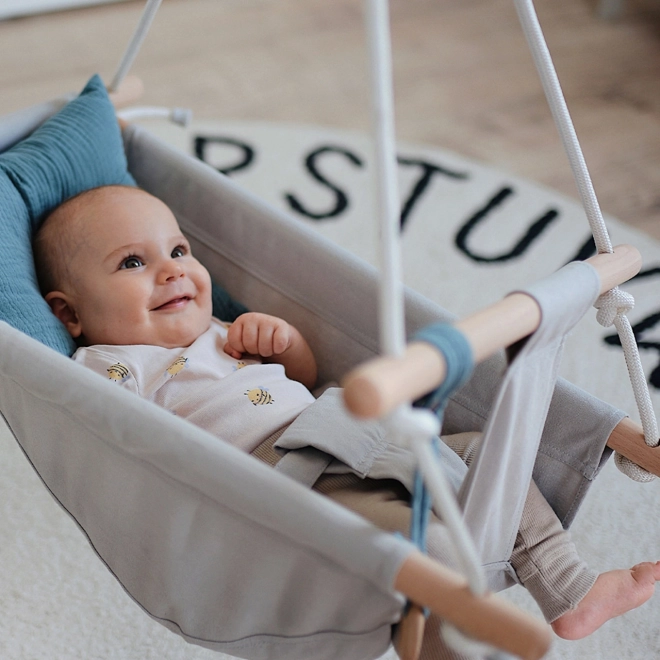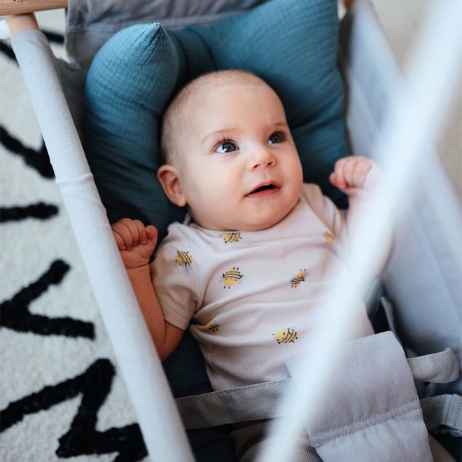 Gugalnica za najmlajše Morje nudi izjemno udobje za vašega otroka. Opremljena je z mehkimi, odstranljivimi blazinami, ki so pritrjene s trakovi, in tritočkovnim pasom za maksimalno varnost. Dizajn v dimno modri barvi v popolni harmoniji s skrbno obdelanim masivnim lesom dodaja šarm vsaki sobi ali vrtu.