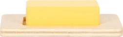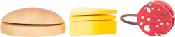 deska (ena stran kot tabla za kredo) z zanko za obešanje, leseni nož, paradižnik, kumara, korenje, jabolko, banana, kos sira, salama, maslo, pekovski izdelki; deli povezani z ježkom