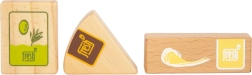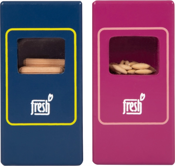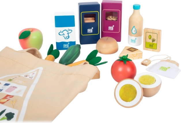 Komplet vegetarijanske hrane Fresh prinaša otrokom vse, kar potrebujejo za ustvarjalne kuharske in trgovske igre. Leseni kosi, kot so mleko, maslo, sir, olje, jajca, riž, testenine, pekovsko pecivo, jabolko, paradižnik, kumara in korenje, dopolnjuje plastenka vode in čajna vrečka. Realistične podrobnosti, vključno z okencem na embalaži riža in testenin (ob tresenju oddajata zvok), povečujejo privlačnost in pristnost igre.