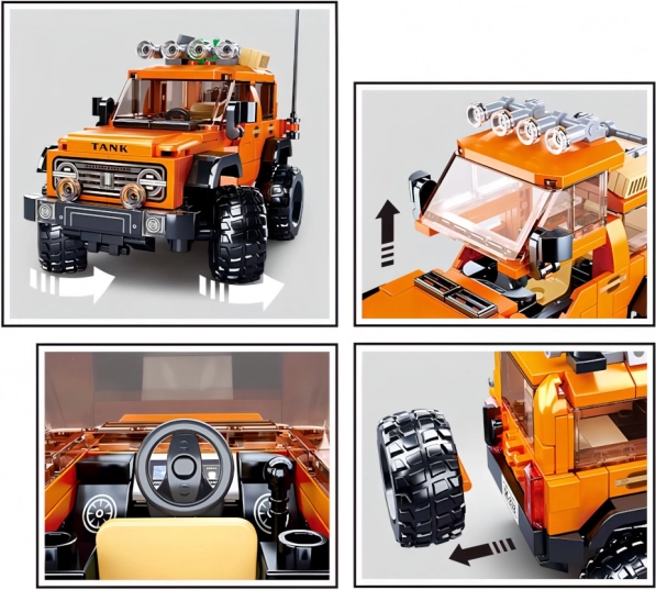 Odkrijte zabavo ustvarjanja s terenskim vozilom, navdihnjenim po ameriških SUV. Model v oranžno-črni barvni kombinaciji z masivnimi kolesi, strešnim nosilcem in podrobno masko hladilnika je idealen za akcijske scenarije in razstavljanje na polici. Zaradi trpežnega ABS plastika je sestavljanka obstojna in varna.