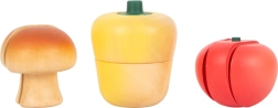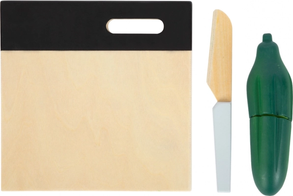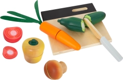 V setu so lesen nož, deska in zelenjava. Ponovno uporabna embalaža služi za shranjevanje igrače in uči otroke ekološkega razmišljanja.