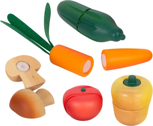 Paradižnik, paprika, kumara, korenje in šampinjon so razdeljeni na polovice in držijo skupaj s sprijemalnim trakom – idealno za vadbo varnega rezanja.