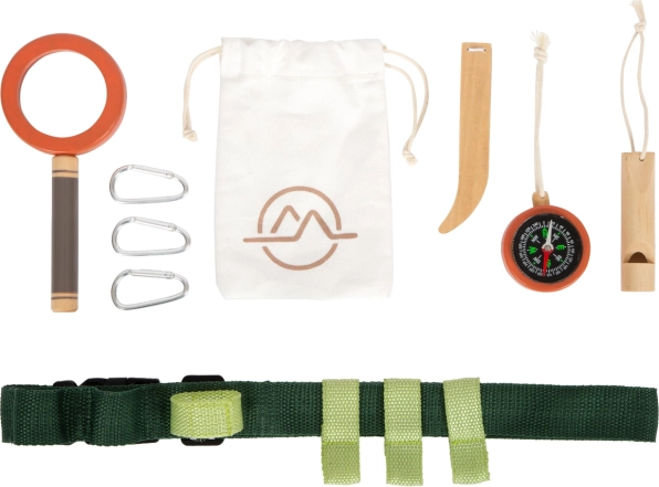 Podajte se na nepozabne pustolovščine s pasom, polnim opreme. Otroke bo navdušil vzdržljiv pas, ki vključuje leseno piščalko, lupo, pinceto, kompas, vrv in tekstilno vrečko. Vse je enostavno pritrditi s pomočjo obročkov in karabinov.