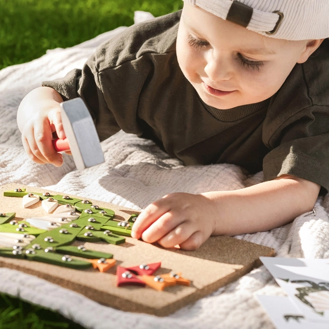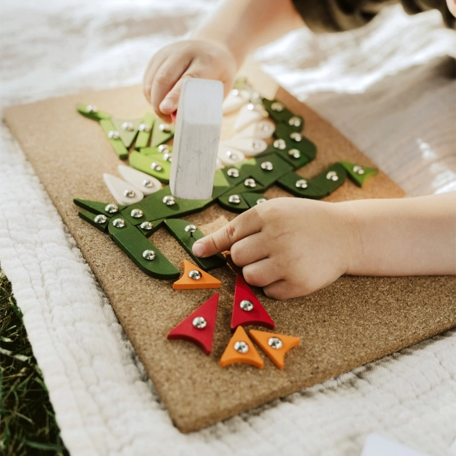 Kreativna zabijalska igra za otroke, ki razvija njihovo fino motoriko in ustvarjalnost. Set vključuje plutasto podlago, leseno kladivo in različne barvne lesene koščke.