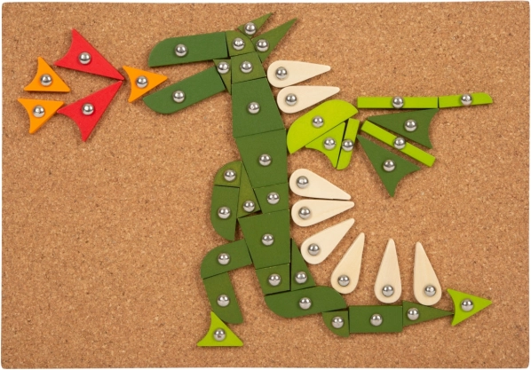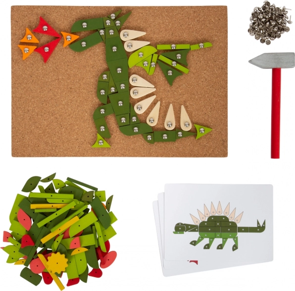 Set vključuje plutasto podlago, leseno kladivo, barvne koščke in žebljičke za ustvarjanje slik.
