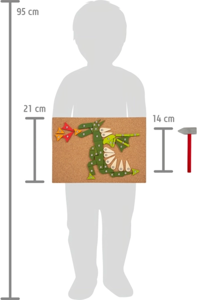 Ta zabijalska igrača je idealna za male raziskovalce z domišljijo. Razvija motorične spretnosti in spodbuja ustvarjalnost pri otrocih. Set vsebuje koščke različnih oblik in barv, ki jih je mogoče zlahka zabijati v plutasto podlago.