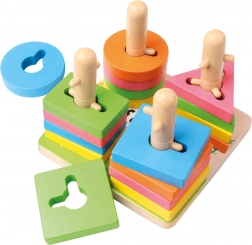 Natikanje na stebričke in poravnavanje odprtin spodbuja koordinacijo oko–roka, spretnost prstov in natančnost gibov.