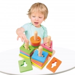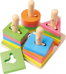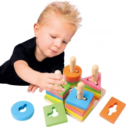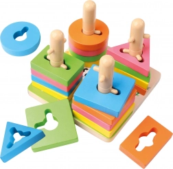 Barvni geometrijski delci z izrezi otroke vodijo k naravnemu prepoznavanju oblik in barv, hkrati pa razvijajo logiko in zbranost.