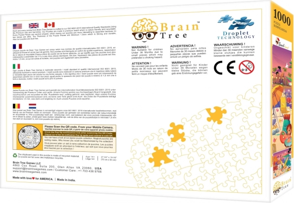 - Sestavljanka 1000 koščkov, plakat 52 × 30 cm, kartonski razvrščevalni predalčki, stojalo za pokrov škatle, zapiralna vrečka