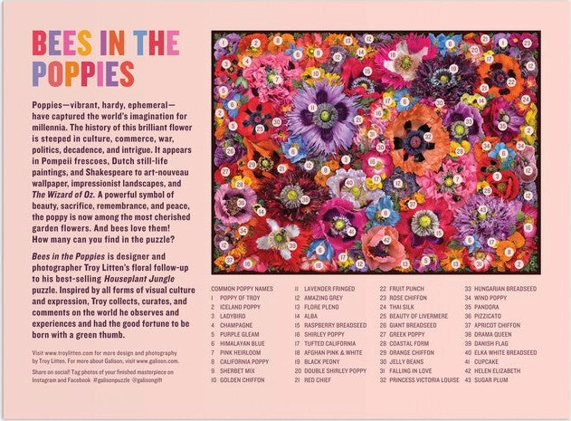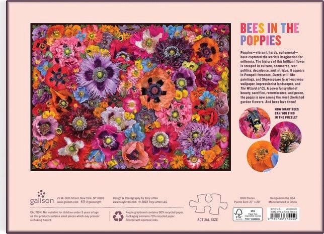 Ta vrhunska sestavljanka znamke GALISON prikazuje edinstven posnetek ameriškega popotnika in fotografa Troya Littena: čebele med desetinami sort cvetov maka. Visoka raven detajlov in barvni kontrast bosta navdušila vsakogar, ki išče kakovosten in estetsko dovršen motiv.