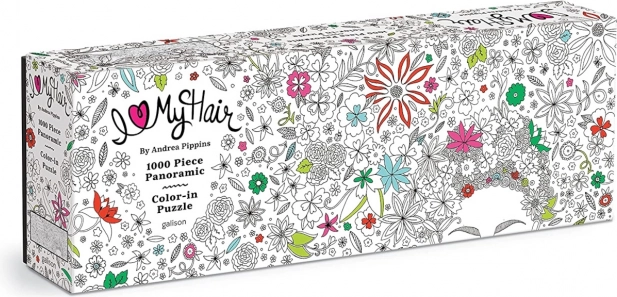 Panoramska sestavljanka I Love My Hair združuje veselje do sestavljanja z ustvarjalnostjo barvanja. Črno-beli motiv s cvetlicami in lasnimi ornamenti kar vabi k izražanju lastne domišljije – barvice ali flomastri bodo sliko spremenili v vašo edinstveno dekoracijo.