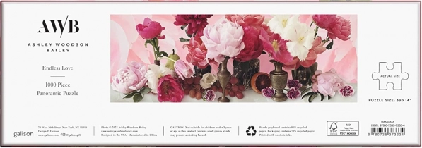 Uživajte v sprostitvi ob panoramski sestavljanki z motivom Endless Love avtorice ASHLEY WOODSON BAILEY. Razkošna sestavljanka s 1000 koščki znamke GALISON iz recikliranega papirja ponuja vrhunski tisk z neškodljivimi barvami, mat zaključek za pristne barve brez bleščanja ter skrbno izbran cvetlični motiv, navdihnjen z nizozemskimi tihožitji.