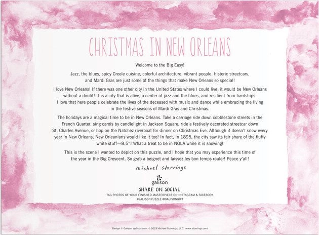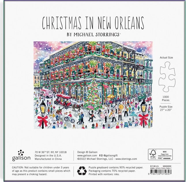 Odkrijte praznično razpoloženje zibelke jazza – glasba, ples in druženje v slikovitih uličicah New Orleansa oživijo v tisočerici koščkov. Sestavljanka znamke GALISON z ilustracijo Michaela Storringsa prinaša verne barve, precizen izrez in prijetno gladko hrbtno stran, ki olajša rokovanje in shranjevanje.