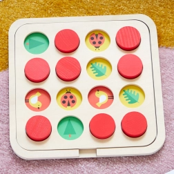 Igralna plošča s 16 pokrivnimi žetoni je zasnovana za male igralce od 3 let naprej. Podpira razvoj kognitivnih spretnosti, prepoznavanje oblik in barv ter urjenje potrpežljivosti in zbranosti. Ilustracije so izrazite, igrive in lahko berljive.